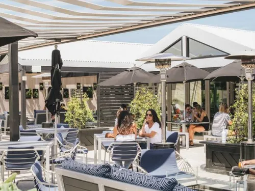 Whisknladle Hospitality is one of San Diego's premier restaurant groups, and Catania is their Coastal Italian concept. While everyone clamors for the ocean views along Prospect Street, Catania's rooftop is unique in that it's receded. Below, you can see shoppers strolling the streets of La Jolla, and the sun sets behind the historic Grande Colonial Hotel in the distance. An electric shade screen is automatically drawn at sunset every night, and everyone on the patio raises a glass.