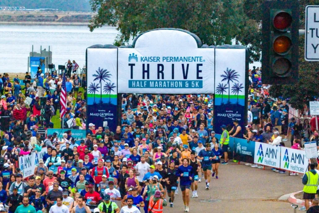 The tenth annual Kaiser Permanente Thrive Half Marathon and 5K, benefiting Make-A-Wish San Diego, offers a scenic loop course through the heart of Mission Bay. This event promotes a Thrive lifestyle, encouraging participants to stay active, eat healthily, live well, and give back to the community.