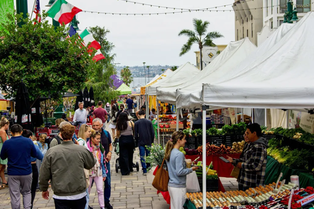 Experience the Little Italy Mercato: Farmers' Market every Wednesday from 9:30am-1:30pm, year-round, rain or shine. The Wednesday Mercato is a growing mid-week market spanning three blocks of W. Date Street from Kettner Boulevard to State Street, featuring many of the same beloved farmers and vendors from Saturday—plus weekday exclusives.