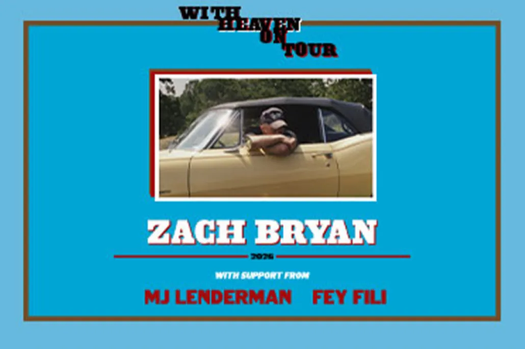 Zach Bryan is set to embark on his biggest international tour yet: With Heaven On Tour, a US and European run of dates kicking off March 7, 2026 in St. Louis, MO at The Dome at America's Center. The tour spans over 40 dates across North America and Europe, including stops in London, Berlin, Oslo, Cork, San Diego, Arlington, TX, and Foxborough, MA before wrapping up October 10 at Jordan-Hare Stadium in Auburn, AL. Tour includes stops at Snapdragon Stadium on Friday, July 31 and August 1, 2026 with special guests MJ Lenderman and Fey Fili.