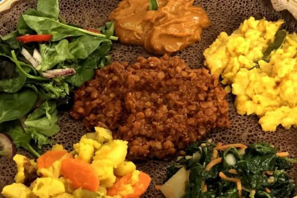 - Injera Platter (injera with your choice of 2 dishes and sambusas)