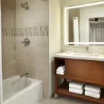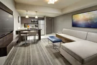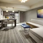 The pairing of Hilton Garden Inn and Homewood Suites is a match made in heaven, offering 364 total guest rooms and suites, complete with refrigerator, microwave, large flat screen TV, and Wi-Fi Internet access. Completely brand new, our rooms and suites blend modern style with ultimate efficiency. Soothing neutral tones with splashes of color create a relaxing vibe that captures the laid back nature of San Diego. Plus, with a bevy of on-site amenities and services like Bayside Kitchen + Bar - a full-service restaurant, 24-hour market and business center, state-of-the-art fitness center, and even a rooftop pool and spa with scenic views, our Bayside Campus is built for the active modern lifestyle.