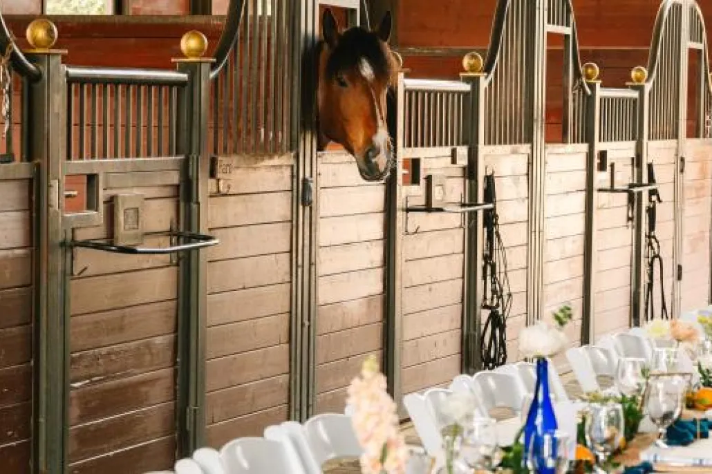 Our equestrian barn surrounded by our therapy horses and stalls creates a unique setting for your seated reception. Imagine a long, European style reception table creating bustling conversation over the warm glow of candlelight. Create a full event experience for your guests featuring a cocktail hour on the Brickyard Terrace for additional pricing. Guest Capacity: 40 Seated